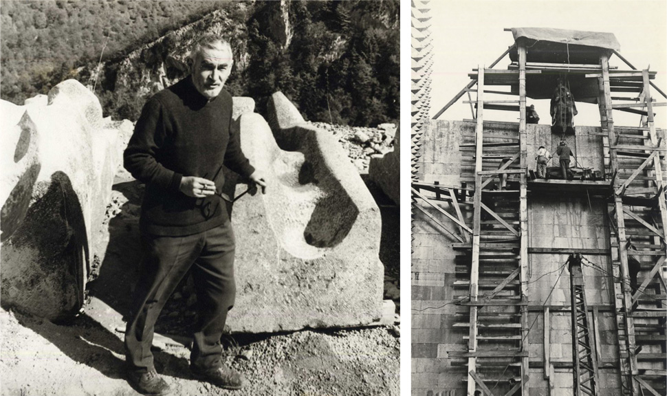 Jorge Oteiza eskultorea hamalau apostoluak eta pietatea kokatzeko lanetan, Arantzazuko Santutegian, 1968an. Argazkia: Plazaola. Oteiza Museoa / Wikimedia commons.